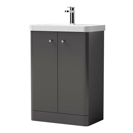 The short projection close coupled toilet only projects 600mm from the wall and features a stylish soft curved design, whilst the practical freestanding gloss grey vanity unit offers ample storage for your toiletries, keeping bathroom surfaces neat and tidy.